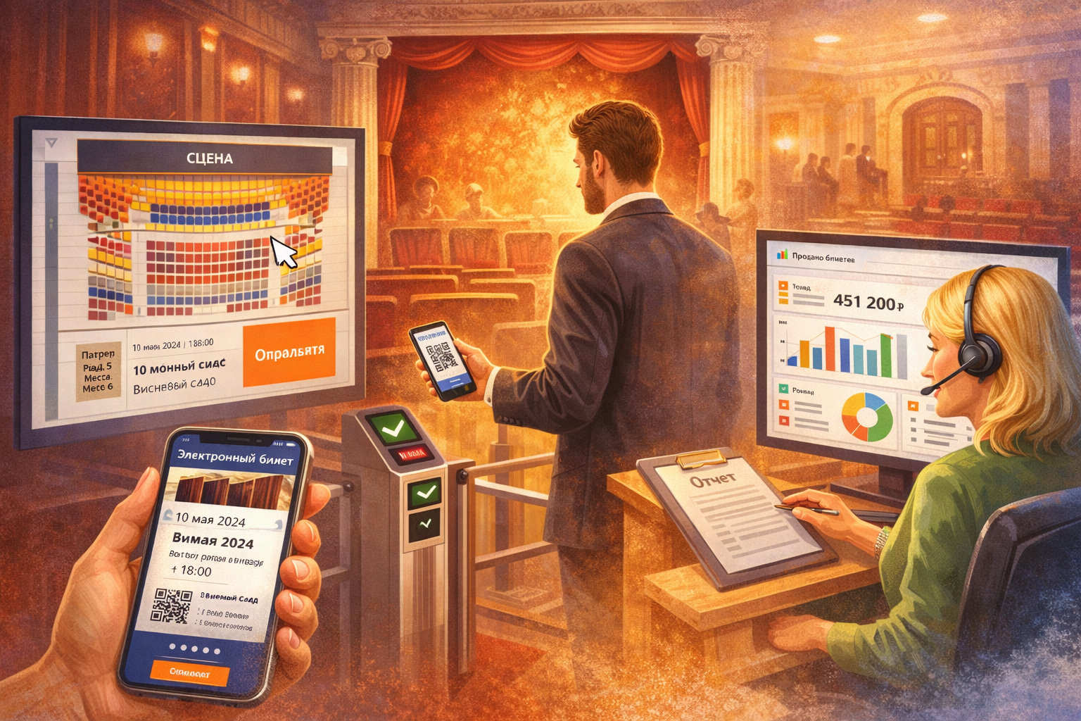 Современный театр — это сложная структура с репертуаром, планом зала, различными категориями мест и постоянной работой с аудиторией. Электронная билетная система позволяет автоматизировать продажи, контроль входа и управление спектаклями.